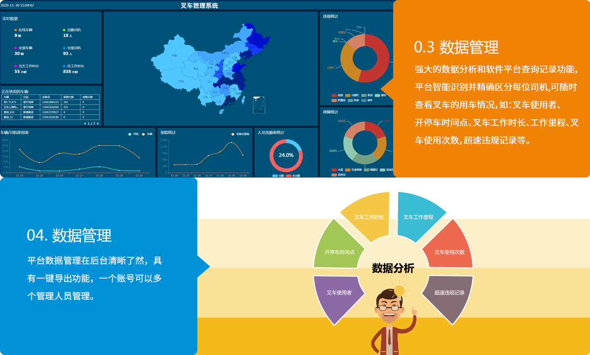 查看实时数据,车辆司机使用率,里程、违规、人员出勤率、故障等数据统计