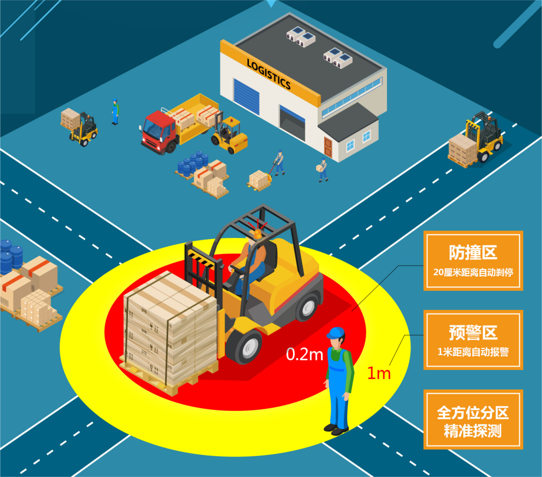叉车作业区域管理系统通过传感器、叉车区域边界灯,实时监控叉车的位置和状态,当行人进入到调整好的红线安全范围内,将会触发设定的语音提醒、区域灯闪烁,提醒司机、行人注意安全,叉车作业中没有发生安全事故,就是能够提高作业效率。